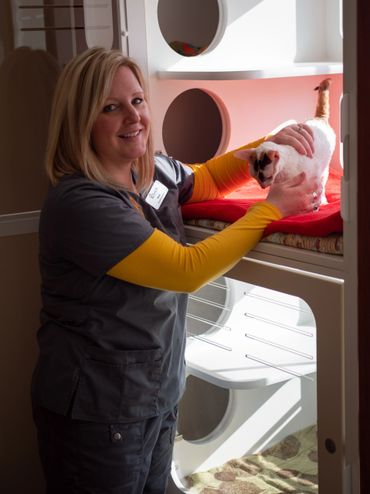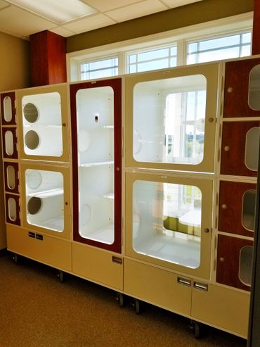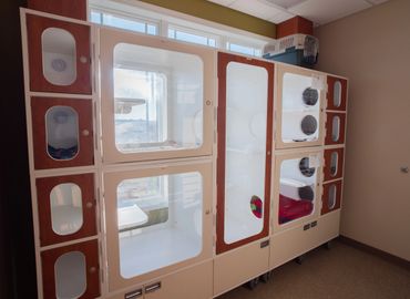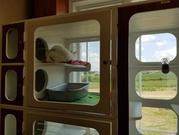 All of our feline guests have a sun-lit, private condo with a view overlooking the "M". Warm, clean linens are provided for everyone as well as litterpans cleaned at least once per day! We have 4 feline condos available with a large multi-level play area between condos- this play area is accessible by each individual guest during different times of day or can be accessed by multiple cats for group play time upon owner request. Adjoining condos are available on request if your cats enjoy each others company. These condos have access to each other through their very own, private door so your cats can visit and play together and get double the space! Our feline guests are fed and watered at least 3 times a day and often staff members can be found giving extra attention to our feline guests.